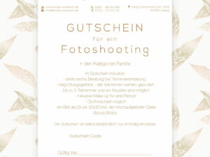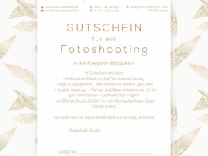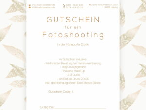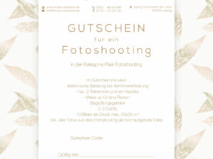 Bei vielen Angelegenheiten stellt sich die Frage. “Was schenke ich nur?” Es gibt wenige Geschenke, die so universell einsetzbar sind wie Fotos. Darum ist ein Gutschein für ein Fotoshooting bei uns das passende Geschenk für fast jeden. Ein Gutschein ist das ideale Geschenk zum Geburtstag, Weihnachten, Jahrestag oder jeder anderen Gelegenheit. Mit dem Fotoshootinggutschein verschenken Sie bleibende Erinnerungen, über die sich eigentlich jeder freut. Ob als Familie, als Paar oder auch als Erotikfotoshooting für den Partner, hier ist für jeden Geschmack etwas dabei. Selbstverständlich haben Sie die Möglichkeit online Gutscheine für unsere Fotoshootings zu kaufen. Sie können sich die Gutscheine sofort herunterladen. (Ideal, wenn es mal schnell gehen muss 😉.) Oder Sie lassen sich die Gutscheine auf premium Papier per Post zuschicken. Ganz wie Sie mögen. Die Gutscheine sind 3 Jahre gültig und können im Einzelfall auch verlängert werden.